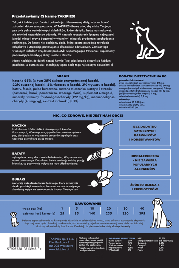 Naszą karmę z KACZKĄ polecamy psom, które zakończyły etap najbardziej intensywnego wzrostu (im mniejszy pies, tym okres dorastania kończy się wcześniej).