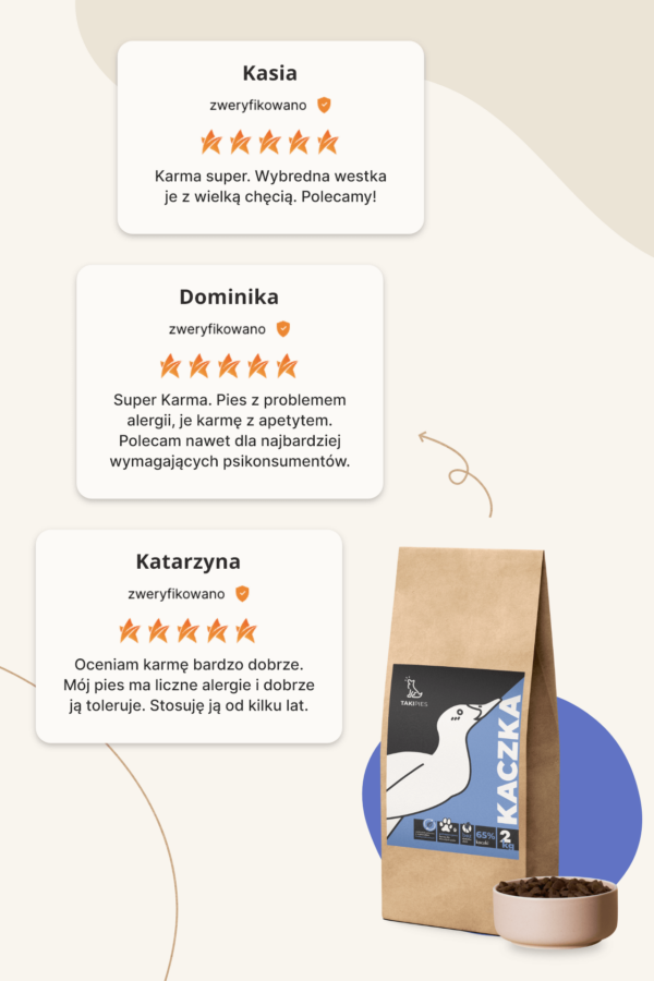 Jestem właścicielką dwóch psów: Frugo i Vaiany. O ile ten pierwszy zje wszystko, to Vaiana długo była niejadkiem i ciężko było znaleźć odpowiedni dla niej smak. Z karmą TAKIPIES było inaczej - KACZKA i ŁOSOŚ od razu przypadły obu psiakom do gustu! Trawienie bez najmniejszych problemów, brak wzdęć, kupy niewielkie, co świadczy o dużej ilości składników przyswajalnych w karmie. Psie brzuszki polecają!- Martyna, właścicielka Vaiany i Frugo