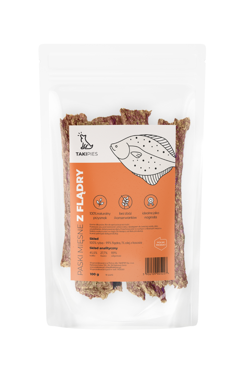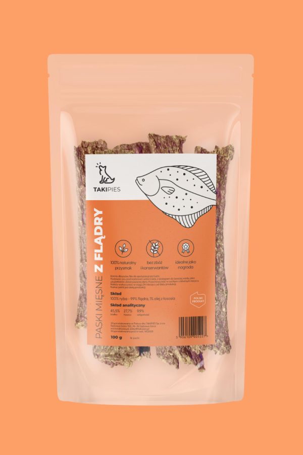Smakowita i łatwa do strawienia przekąska z flądry w formie pasków mięsnych – idealne jako nagroda i uzupełnienie codziennej diety psa.