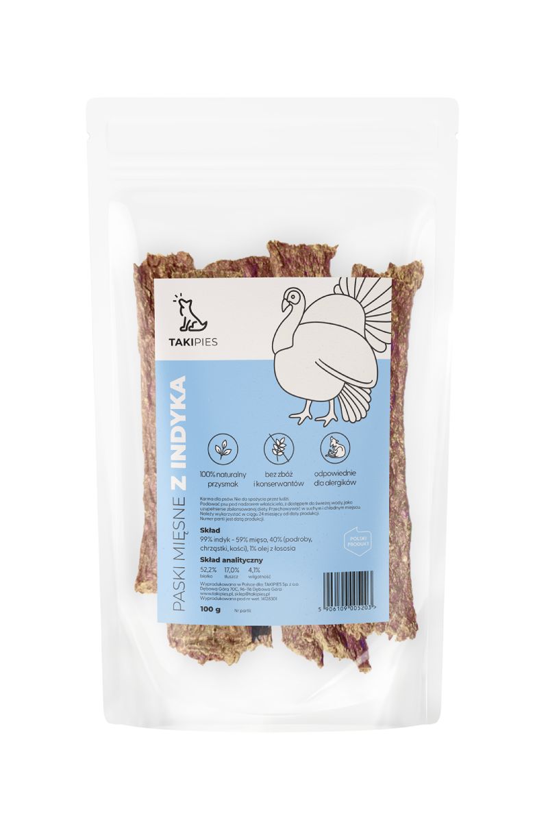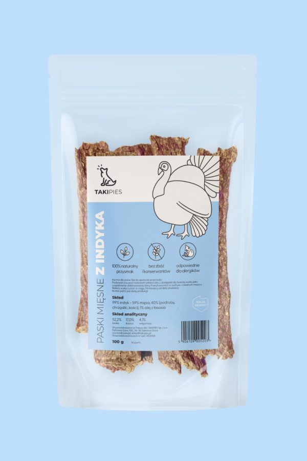 Smakowita i łatwa do strawienia przekąska z indyka w formie pasków mięsnych – idealne jako nagroda i uzupełnienie codziennej diety psa.