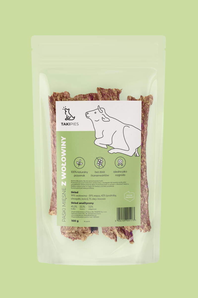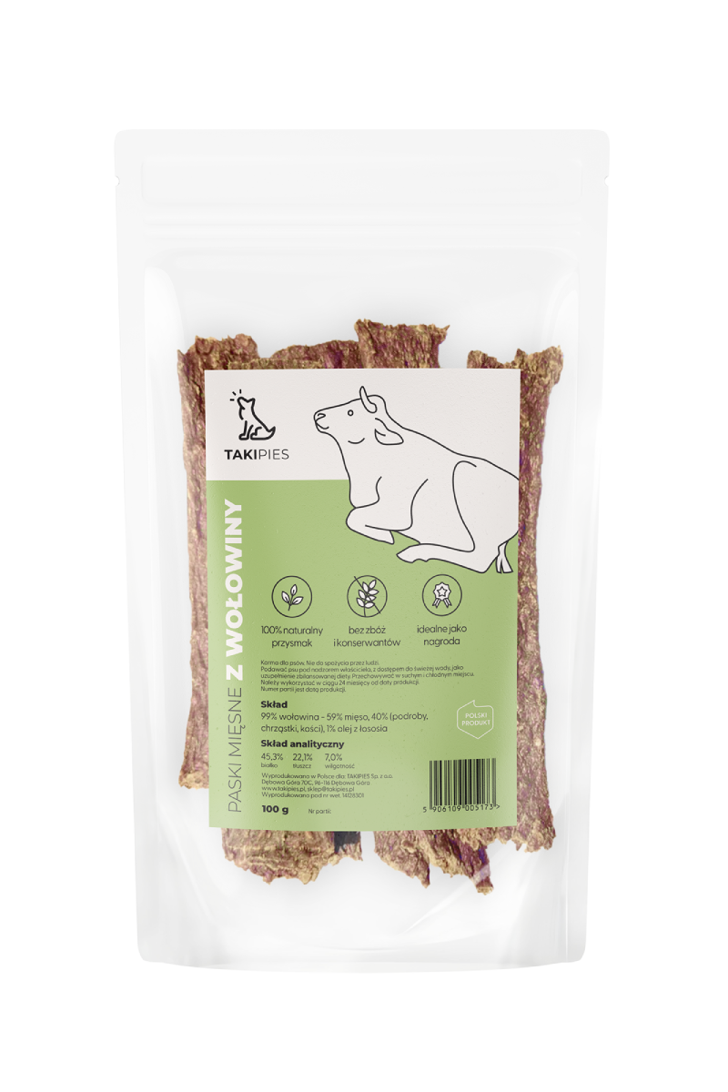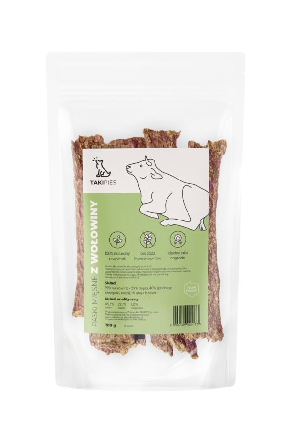 Smakowita i łatwa do strawienia przekąska z wołowiny w formie pasków mięsnych – idealne jako nagroda i uzupełnienie codziennej diety psa.