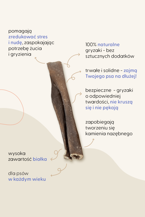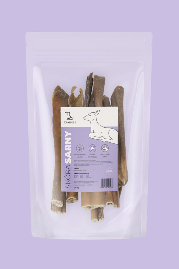 Zdrowy gryzak ze 100% skóry sarny zapewnia długotrwałą zabawę, zaspokajając przy tym naturalną potrzebę żucia i gryzienia.