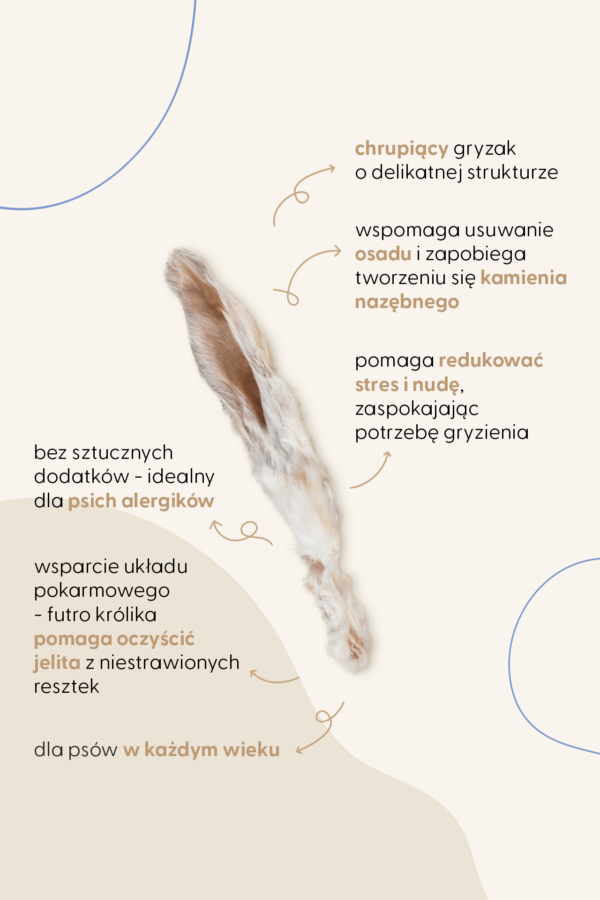 Hipoalergiczna przekąska, idealna dla psów z wrażliwym żołądkiem. Dzięki włóknom z futra gryzak oczyszcza jelita i usuwa zalegające resztki pokarmowe, wspierając przy tym proces trawienia.