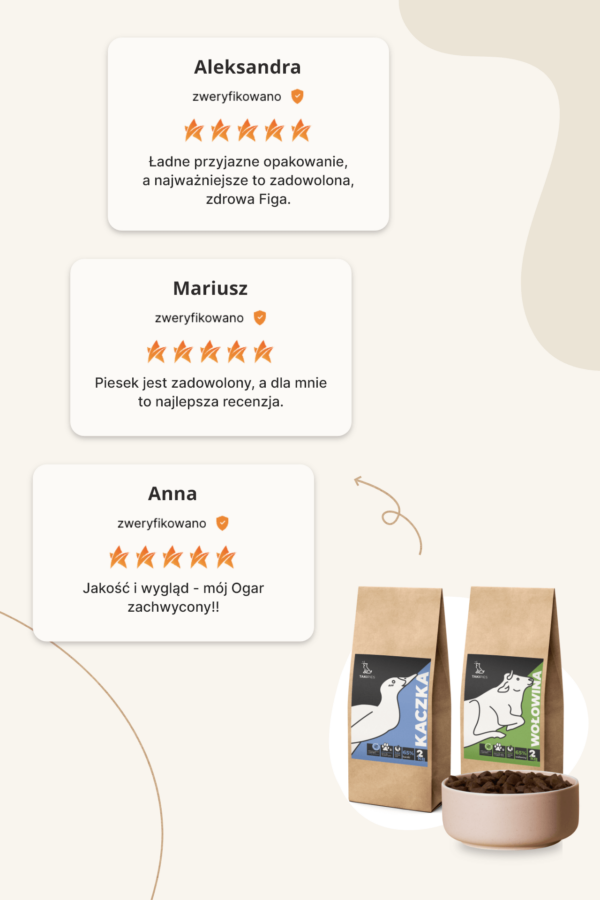 Jestem właścicielką dwóch psów: Frugo i Vaiany. O ile ten pierwszy zje wszystko, to Vaiana długo była niejadkiem i ciężko było znaleźć odpowiedni dla niej smak. Z karmą TAKIPIES było inaczej - KACZKA i ŁOSOŚ od razu przypadły obu psiakom do gustu! Trawienie bez najmniejszych problemów, brak wzdęć, kupy niewielkie, co świadczy o dużej ilości składników przyswajalnych w karmie. Psie brzuszki polecają!- Martyna, właścicielka Vaiany i Frugo