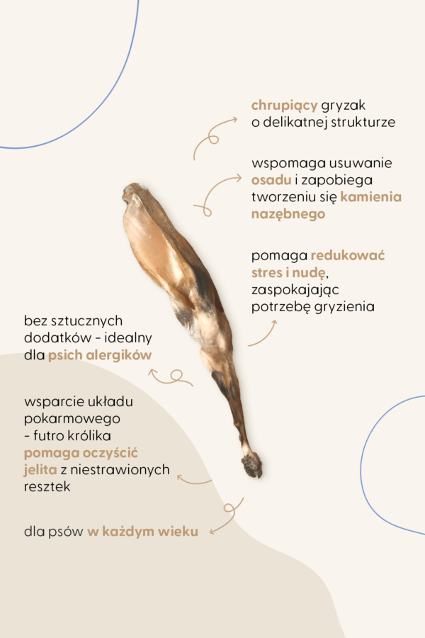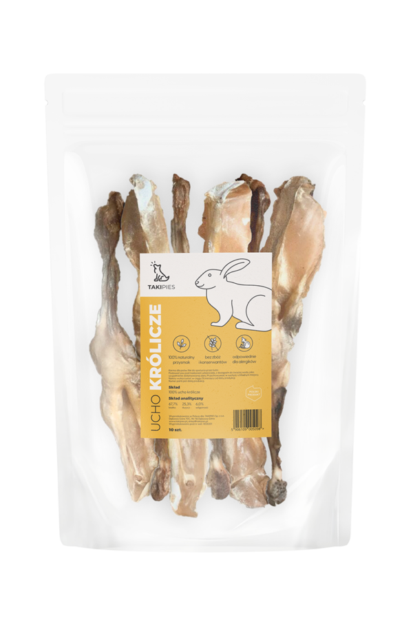 Hipoalergiczna przekąska ze 100% uszu króliczych zaspokaja naturalny instynkt żucia i gryzienia oraz stanowi doskonałą nagrodę zarówno dla psów dorosłych, jak i dla szczeniąt.